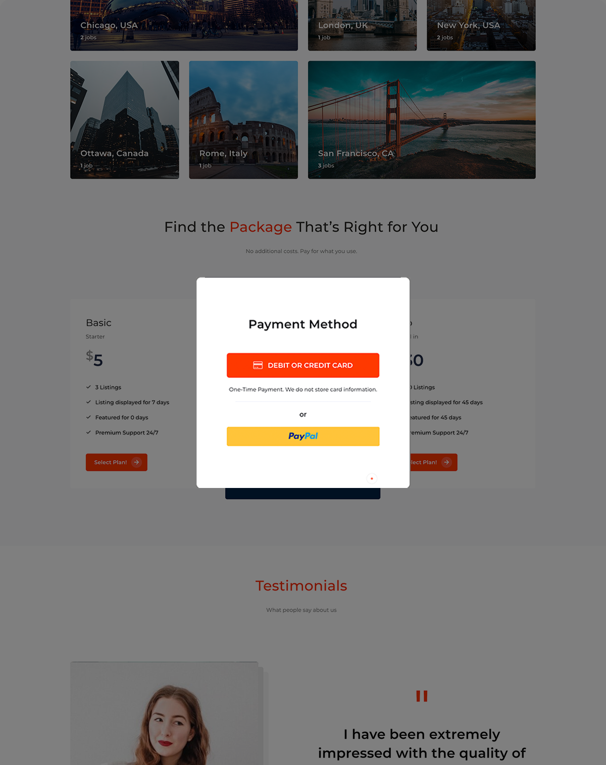 JobRoyal has built in packages option with PayPal and Stripe payment gateways built in.